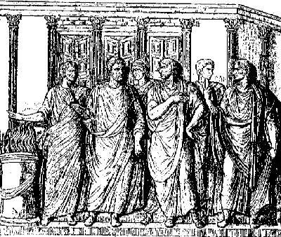 Но когда народ обнаружил в этом правлении одни лишь притеснения и снова потребовал царя, то между старыми римлянами и присоединенными к ним сабинянами обнаружился разлад, так как каждая сторона желала выбрать царя из своей среды. Наконец, порешили на том, чтобы выбрать Нуму Помпилия из сабинян, который отличался мудростью и справедливостью; проживал он в то время в Курах. Он до тех пор не хотел принять правления, пока не получил благоприятных знамений, стоя на Капитолийском холме в окружении жрецов. Затем Нума Помпилий собрал патрициев в их куриях и спросил, желают ли они добровольно повиноваться всем его приказаниям. Только тогда, когда они его в этом уверили, он согласился принять царское достоинство. Нума Помпилий доставил своему народу мир, согласие, внутренний порядок и богослужение. Казалось, что все это происходит из божественного источника. Поэтому предание уверяет, что всеми этими делами он был обязан мудрым наставлениям нимфы Эгерии, с которой он был соединен священными узами. Нума Помпилий рассчитывал, что религия и власть ее над сердцем человеческим должна иметь благотворное влияние на одичавших от войн римлян. Для этого богослужения были обставлены так, чтобы возбуждать в гражданах чувство благоговения к богам. Во время богослужений, жертвоприношений или религиозных церемоний он каждый раз приказывал глашатаям ходить по улицам и предписывать тишину и прекращение всяких частных занятий, дабы никакой шум или крик ремесленников и других рабочих не мог нарушать необходимого спокойствия. Чтобы придать богослужению определенное и прочное устройство, Нума Помпилий наряду с обычными жрецами — фламинами, учредил еще жреческие коллегии, а именно: высших жрецов (понтификов), имевших общий надзор, птицегадателей (авгуров), на обязанности которых лежало узнавать волю богов по небесным знамениям, по полету и крику птиц и по клеванию зерен священными петухами; гаруспиков, предсказывавших по внутренностям жертвенных животных. Кроме того, он ввел новые роды богослужения. К ним причисляют учреждение весталок — молодых девушек, подобных тем, которые существовали когда‑то в Альба‑Лонге, как это видно из истории Ромула. Обязанность и долг этих весталок‑девственниц главным образом состояли в том, чтобы поддерживать священный огонь на алтаре богини Весты. Он был для всего города тем же, чем был неугасимый огонь, который горел в очаге каждого дома и считался священным для всех членов семьи. Таким образом, и огонь в храме Весты символизировал государство как единую семью. Если огонь угасал, это предвещало бедствие для города, и виновные весталки жестоко наказывались: их заживо погребали. Такое же наказание постигало и тех из них, которые нарушали даваемый ими обет девственности. Но в то же время весталки пользовались величайшим почетом и уважением. Подобно тому, как весталки поддерживали священный огонь, салии (танцовщики) охраняли упавший с неба при Нуме Помпилий щит. Для того, чтобы вернее сберечь его, Нума Помпилий приказал изготовить много других щитов, совершенно с ним схожих. В марте и октябре салии исполняли ритуальные танцы, имея в левой руке один из таких щитов, а в правой — копье. Салиев сравнивают с критскими куретами, которые исполняли в честь богини Реи танцы под звуки музыки и стук оружия. Это было единственное б