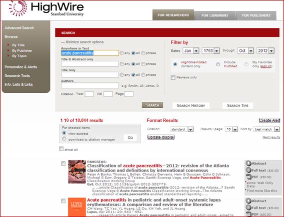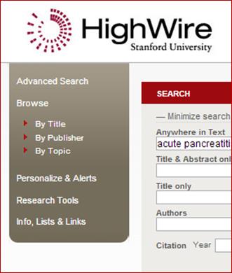 1. Зайдите на сайт http://highwire.stanford.edu/ 2. Напишите в поисковой строке acute pancreatitis и нажмите Search (Поиск):