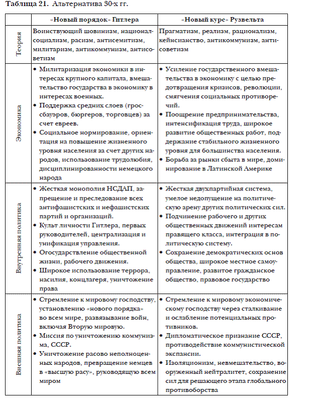 В США под руководством Франклина Делано Рузвельта, победившего на выборах 1932 г., была выработана политика «нового курса». ФДР (так его называли в Америке) был реалистом до мозга костей, последовательным прагматиком, опирался на советы лучших интеллектуалов. Он откровенно заявлял о своей миссии: «Я хочу избежать революции». Можно сказать, что новый президент США просто спасал капитализм. В реальности он осуществил серьезную модернизацию западной индустриальной цивилизации. В марте 1933 г. чрезвычайная сессия конгресса США за 10 дней утвердила предложения президента. Были сохранены только «здоровые банки». Свыше 2 тыс. мелких банков были ликвидированы. Золотая валюта изымалась из обращения. Была снижена зарплата федеральным служащим. Пособия ветеранам Первой мировой войны и другие социальные программы урезались. Безработные за бесплатное питание и небольшую плату (на пачку сигарет в день) работали на строительстве дорог, очистке лесов, мелиорации и т. д. Доллар был девальвирован, что облегчило погашение фермерской задолженности и повысило конкурентоспособность американских товаров за рубежом. Были утверждены «кодексы честной конкуренции», которые предусматривали установление 35-часовой рабочей недели, минимальную заработную плату, нормы по технике безопасности и охране труда. 90 % предпринимателей согласились пойти на эти уступки рабочим и взамен получили поддержку от государства. Гарантировалось право рабочих на коллективный договор и объединение в профсоюзы. Закон о социальном страховании (1935) вводил пенсии по старости, пособия по безработице, инвалидности и бедности. Правительство выделило значительные средства для поддержки промышленности и сельского хозяйства. Был отменен «сухой закон», возобновлена продажа спиртного, что устранило почву для многих криминальных явлений. Несмотря на противоречия, конфликты и застойные явления, характерные для развития США в 1930-х гг., «новый курс» позволил американскому капитализму обрести «второе дыхание». Ядром «нового курса» стало прямое государственное вмешательство и жесткая, порой мелочная регламентация хозяйственной жизни ради гармонизации социальных отношений. В рамках «нового курса», провозглашенного президентом от Демократической партии, ускорилась интеграция рабочего движения в американский истеблишмент. Американская буржуазия, выдвинув своего лидера, показала умение маневрировать, изыскивать резервы развития внутри капиталистической системы, которая буквально за несколько дней (причем в конституционных, демократических рамках) была спасена. «Новый курс» представлял собой самую радикальную волну реформ в истории США. Новые принципы организации жизни общества впоследствии получили широкое распространение в других странах.