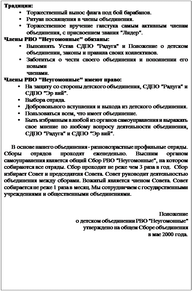 На титульном листе устава ДОО нужно указать, когда на общем сборе был принят данный документ. Основные цели и задачи общественного объединения (организации) формулируются в Уставе (ст. 20. Закона Российской Федерации «Об общественных объединениях», 1995 г.). Устав общественного объединения (организации) должен включать: · название, цели и задачи деятельности объединения (организации), его организационно-правовую форму; · структуру объединения (организации), руководящие и контрольно-ревизионные органы, территорию, в пределах которой объединение (организация) осуществляет деятельность; · условия и порядок приема в члены объединения (организации), выхода из него в случаях, когда объединение (организация) имеют фиксированное членство; · права и обязанности членов объединения (организации); · компетенцию и порядок образования руководящих органов общественного объединения (организации), сроки их полномочий; · источники образования средств и иного имущества объединения (организации); · порядок внесения изменений и дополнений в Устав общественного объединения (организации); · порядок прекращения деятельности общественного объединения (организации);
