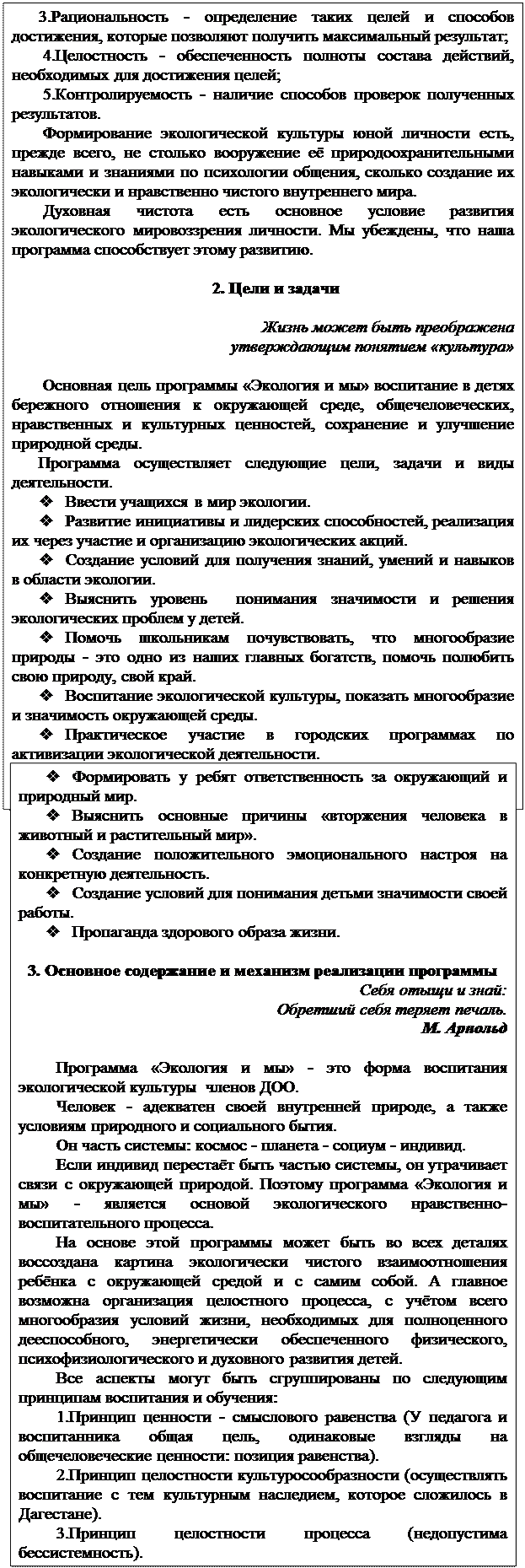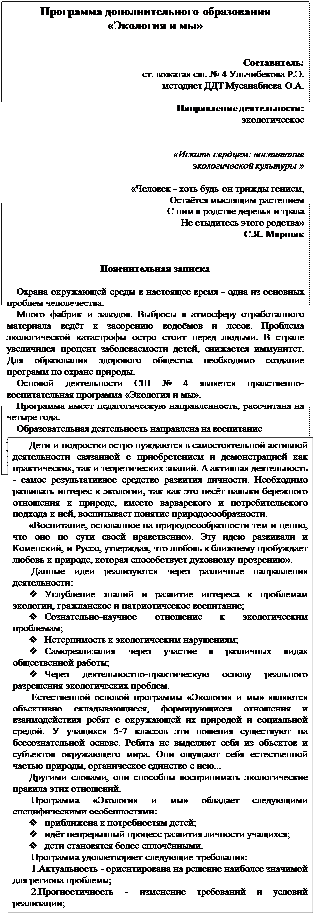 Программа «Экология и мы» как целенаправленная система решает задачи выявления, воспитания и развития детей, склонных к постоянному самообразованию, умению жить в созвучии с окружающим миром, всем, чем руководствуется в своей жизни экологически культурный человек.