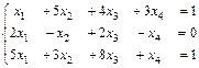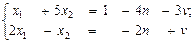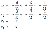т.е. r < n, система имеет множество решений. Выделим базисный минор матрицы А За базисные неизвестные выберем х1 и х2, и так как коэффициенты при х1 и х2 являются элементами базисного минора, то х3 и х4 будут свободными неизвестными: Для того чтобы найти решение системы, дадим произвольные значения свободным неизвестным, например x3 = n; x4 = v: