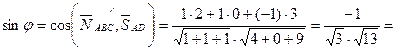 Даны точки А (1,0,1), В (-1,2,1), С (0,-1,-1). Найти: а) уравнение плоскости, проходящей через точки А,В,С; б) уравнение плоскости, проходящей через точку D (-1,0,-2) параллельно плоскости АВС; в) расстояние от точки D до плоскости АВС; г) уравнение прямой АD; д) угол между прямой АD и плоскостью АВС. Решение: а) Уравнение плоскости, проходящей через три данные точки, имеет вид: