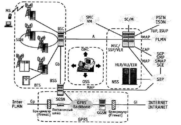 На рис. 3 показана обобщенная схема построения сети GSM. Всю сеть можно логически разделить на несколько частей: подсистему базовых станций (BSS), подсистему коммутации (NSS), подсистему ТЭ и ТО (ОМС). Кроме того, в отдельную подсистему можно выделить сеть пакетной передачи GPRS.