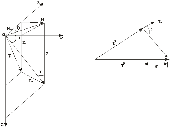 Магнитное поле Земли подобно полю диполя, помещенного в центр шара. Вектор магнитной индукции Следует обратить внимание на то, что в северном полушарии, т.к. вектор направлен вниз, расположен южный полюс диполя, а в южном полушарии - северный. (По физической сущности, у постоянных магнитов силу взаимного притяжения испытывают всегда разноименные полюса). Магнитное поле северного полушария принято называть северным, а южного полушария - южным. При переходе от одной точки поверхности Земли к другой вектор Рассмотрим составляющие полного вектора напряженности геомагнитного поля