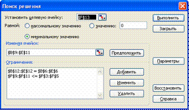 · столбец Всего заполняем формулой суммы по строках Матрицы_распределения; · столбец Резерв заполняем формулой: Ресурс-Всего; · строку Сделано заполняем формулой: =СУММПРОИЗВ(Продуктивность; Работа_n); · в целевую ячейку вводим формулу: =СУММПРОИЗВ(Матрица_себестоимости; Матрица_респределения).