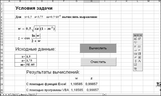 Рис. 4.3 − Образец оформления линейной программы на листе Excel Для кнопки «Вычислить» напишем следующую процедуру: Private Sub CommandButton1_Click() Dim x As Single, a As Single, m As Single, w As Single, z As Single x = Worksheets("Лист2").Range("c17") a = Worksheets("Лист2").Range("c18") m = Worksheets("Лист2").Range("c19") w = 0.5 * Sqr(x * a * Abs(1 - m * m)) z = Cos(Log(Abs(w)) / (2 + w)) Worksheets("Лист2").Range("g25") = w Worksheets("Лист2").Range("h25") = z Date: 2015-08-24; view: 439; Нарушение авторских прав |