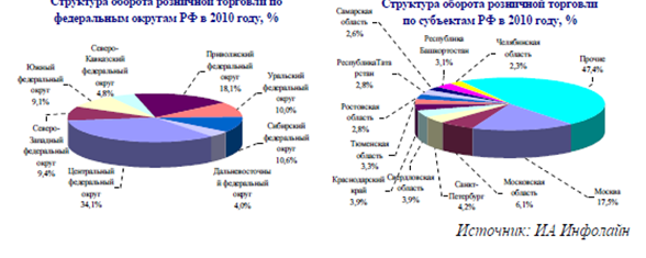 В 2010 году наиболее динамичный прирост доли в общем объеме оборота розничной торговли демонстрируют Центральный федеральный округ (в том числе Москва и Московская область), Северо-Западный федеральный округ (в том числе Санкт- Петербург), Южный и Северо-Кавказский федеральные округа, в то время как оборот розничной торговли в Уральском, Сибирском и Дальневосточном федеральных округах, продолжают демонстрировать падение, начавшееся еще в 2008-2009гг.