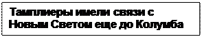 Жак де Майе в книге "Тайный поход тамплиеров" пишет, что в Национальном архиве Франции есть печати ордена, захваченные в 1307 году людьми Филиппа Красивого. На одной из них рядом с надписью "Тайна Храма" изображен человек в головном уборе из перьев и с луком в руке. Сейчас для нас такой рисунок понятен, поскольку мы осведомлены о том, как выглядели американские индейцы, но ни Филиппу, ни папе Клименту такой наряд человека, намекавший на одну из главных тайн храмовников, не говорил ни о чем. В 1507 году Рене II, герцогом Лоренским, была опубликована карта, которую видел в сокровищнице португальского короля Христофор Колумб перед тем как затевать свои решительные экспедиции к Америке (с 1492 года). Копией этой карты руководствовался Магеллан при планировании первого в истории кругосветного путешествия (1519-1521 гг.). На ней обозначены контуры Северной и Южной Америки и пролива между Южной Америкой и Огненной Землей. Карта эта хранилась в сокровищнице португальского короля, куда попала вместе с некоторыми другими секретными документами тамплиеров. < ã Мальцев С. А., 2003 > Португалия была единственной страной в Западной Европе, вставшей на защиту преследуемых рыцарей. В Португалии было самое мощное после Франции отделение ордена и там нашли прибежище братья, бежавшие от арестов в 1307 году. Поэтому королю Португалии достались от тамплиеров такие тайны планеты Земля, о которых он даже не подозревал. Португалия защитила орден и в благодарность за это навсегда вошла в историю как государство, от берегов которого начались два самых великих морских путешествия. К Ля-Рошеля, неприступному форту Ордена на атлантическом побережье Франции, сходились "семь дорог тамплиеров". Там, в глубокой бухте, находился их порт, от которого они отправлялись в регулярные экспедиции к берегам Нового Света. К тем же берегам могли уйти те их корабли с самыми важными ценностями и архивами, которые в октябре 1307-го отплыли из Ля-Рошеля и не появились больше нигде в Европе. У инков была построена целая система мощеных дорог, ведущих к океанскому побережью. На морском берегу, там, где сходились эти дороги, археологами найдены формы для отливки серебра, имевшие доколумбово происхождение. Серебро добывали в горах и, используя в качестве вьючных животных лам, доставляли на берег, где переплавляли его в слитки для удобства транспортировки через океан в Европу. Предания местных жителей рассказывают о таких регулярных караванах, перевозивших большое количество металла. Там же, у инков, тамплиеры могли добывать и золото. Притом, эти экономические контакты цивилизаций Старого и Нового Света нисколько не походили на вторжение в Америку конкистадоров и католических миссионеров после ее "открытия" Колумбом. Древние культуры ни в какой мере не пострадали от деловых связей с храмовниками-христианами. Можно даже предполагать, что у тамплиеров, обосновавшихся в Новом Свете, имелись с его аборигенами общие тайны от пришедших позднее европейских завоевателей. Орденом Тамплиеров руководили Посвященные. Для них все религии мира - проявления единой мировой Религии, и отсюда уважение рыцарей к традициям аборигенов. Для Посвященных не было тайной наличие материка за Атлантическим океаном, по Европе ходили старинные карты - Пири Рейса, Буаше, Меркатора, скопированные с древних папирусов. На нек