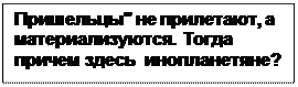 Июнь 1962 года, Верона, Италия. После наблюдения НЛО свидетельница проснулась от ощущения жгучего холода и увидела около дома лысое существо. Она позвала других свидетелей, и все увидели, как оно стало "съеживаться" и исчезло, "будто телевизионное изображение при выключении телевизора". Октябрь 1963 года, о. Уидби, штат Вашингтон. Женщина средних лет заметила странный объект с тремя силуэтами внутри. Объект накренился, частично погрузился в землю, увеличился в размере и, вспыхнув, исчез. Ноябрь 1968 года, Франция. Врач увидел, как два больших дискообразных объекта слились в один, который выпустил в его сторону луч света. Затем объект исчез со взрывом, оставив после себя медленно рассеявшееся облачко" [334]. Последний пример мы рассматривали подробно, там произошло необычное исцеление врача и появление на животе у него и у его ребенка странных треугольных значков. Именно такие "неправильные" детали и отталкивают обычно ученых от темы НЛО. Ведь настоящие инопланетяне и их космические корабли не должны "выключаться" как изображение в телевизоре, не должны делиться, как амебы, на части, увеличиваться и уменьшаться в размерах, менять свою форму, погружаться в землю. Настоящий корабль должен иметь прочный корпус, уметь быстро летать, извергать при необходимости фонтаны огня, подмигивать нам своими сигнальными лампочками, твердо и уверенно стоять на ногах-опорах. Ну а когда очевидцы начинают рассказывать про телепатические беседы с пришельцами, про то, как у пришельцев светятся глаза, как они проходят сквозь стены своих летательных аппаратов или через запертые балконные двери, то какой нормальный ученый, дорожащий репутацией здравомыслящего человека, в это поверит? Нет, пусть уж лучше этим занимаются парапсихологи с уфологами и прочие хироманты! < ã Мальцев С. А., 2003 >