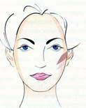 Круглое лицо. Обычно пухлые щеки. Широкий лоб, округлый подбородок. День. Можно на все лицо нанести тональное средство, которое несколько темнее кожи. Тем самым мы визуально уменьшим лицо. Румяна наносим на виски и уголки нижней челюсти. Накладываем румяна под скуловые косточки, как можно более вертикально. "Румянец" должен быть не в виде растушеванной полосы, а более округлым, каплевидным.