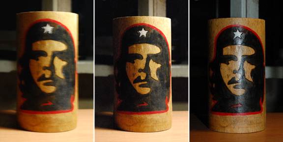 Слева на право: внешняя вспышка “в лоб”, внешняя вспышка в потолок с рассеивателем, внешняя вспышка в потолок без рассеивателя. Теперь я на фотик нацепил внешнюю вспышку. Перво наперво я повторил фокус со вспышкой “в лоб” при этом достал рассеиватель, блик от вспышки стал менее заметен, но Че Геваро все ещё не доволен. Дальше пошли чудеса, отражая свет от потолка с помощью внешней вспышки я практически избавился от блика и тени, блик возле звезды получился из-за рассеивателя. Рассеиватель нужен для того чтобы сильнее рассеивать свет, поскольку угол довольно большой – у меня остался небольшой блик. Поле того как я убрал рассеиватель я добился такого снимка, какого хотел, без бликов и тени, суровый Че Геваро мне чуть не улыбнулся:)