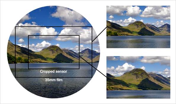 Объектив проецирует круглое изображение на фиксирующий элемент камеры. Для каждого отдельного объектива это изображение будет постоянным, независимо от того, с какой камерой объектив используется. Когда проецируемое изображение попадает на пленку или матрицу, лишь определенная его часть фиксируется. До появления цифровой фотографии зеркальные камеры (в большинстве своем) использовали пленку формата 35mm. Это значит, что все они захватывали одинаковую часть проецируемого объективом изображения и картинка, которую давал конкретный объектив, была постоянной. Цифровые камеры устроены более сложно в данном смысле. Пленка в них заменена на матрицу, которая обычно меньше, чем кадр формата 35mm. Так как матрица физически меньше, то она и захватывает меньшую часть проецируемого изображения, в результате фактически сужается угол поля зрения объектива.