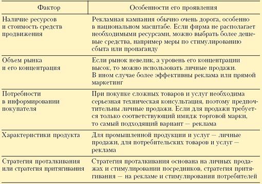 Характеристики услуги таковы, что услугу гораздо труднее продвигать на рынок, чем товар. При продвижении услуги чаще всего демонстрируются образы, субъективно или объективно отражающие процесс предоставления услуги. Так, диапазон предметных образов для рекламирования услуг банка чрезвычайно велик: от аксессуаров банковской деятельности (чеки, пластиковые карты, векселя, деньги) до цветов и животных, выступающих в банковской рекламе в качестве средств иносказания. Стандартные средства коммуникаций в маркетинге следующие. 1. Реклама: объявления в СМИ, объявления на упаковке товара, вкладыши, рекламные ролики, брошюры и буклеты, плакаты и листовки, объявления в справочниках, стенды, объявления на выставках, демонстрация новинок, аудиовизуальные материалы, символы и логотипы. 2. Стимулирование сбыта: конкурсы и игры, призы и подарки, бесплатная раздача образцов, промышленные и другие выставки и ярмарки, демонстрации, купоны, скидки, низкий процент по кредиту, прием старых товаров в счет оплаты при покупке нового товара, долгосрочные клиентские программы. 3. Связи с общественностью: пакеты информации для прессы, выступления, семинары, издание ежегодных отчетов, пожертвования, спонсорство, публикации в периодической печати, поддержание отношений с контактной аудиторией, лоббирование, каталог продукции (услуг) фирмы, специальные мероприятия. 4. Личная продажа: торговые презентации, торговые встречи, поощрительные программы, раздача бесплатных образцов, промышленные выставки и ярмарки. 5. Прямой маркетинг: каталоги, рассылка рекламы по почте, телемаркетинг, покупки через Интернет и телевидение, e-mail, связь по факсу. Факторы влияющие на продвижение товара (услуги) на рынке, представлены в табл. 36.1. Таблица 36.1 Факторы, влияющие на выбор комплекса продвижения товара (услуги)