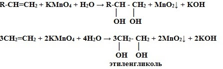 3. Окисление перманганатом калия (р. Вагнера) в нейтральной среде– это качественная реакция алкенов, розовый раствор марганцовки обесцвечивается.