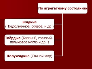 Животные жиры содержат главным образом глицериды предельных кислот и являются твердыми веществами. Растительные жиры, часто называемые маслами, содержат глицериды непредельных карбоновых кислот. Это, например, жидкие подсолнечное, конопляное и льняное масла.