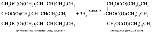 2.Гидрирование жиров – превращение жидких растительных масел в твердые жиры – имеет большое значение для пищевых целей. Продукт гидрогенизации масел – твердый жир (искусственное сало, саломас). Маргарин – пищевой жир, состоит из смеси гидрогенизированных масел (подсолнечного, кукурузного, хлопкого и др.), животных жиров, молока и вкусовых добавок (соли, сахара, витаминов и др.).