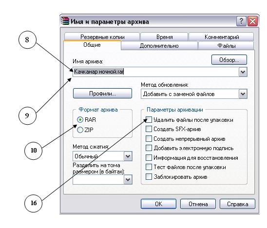 Скопіюйте в папку Архіви файли з папки Практикум. Заархівуйте графічний файл і порівняєте розміри обох файлів. Для цього виконайте такі дії: Клацанням правої кнопки миші виділіть файл типу. Bmp Клацніть на кнопці Додати до архіву..., з'явиться діалогове вікно, що уточнює параметри архівації. Типово архівний файл має ім'я вихідного файлу.