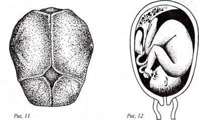 Активно формируется аппарат сосания. Слизистая оболочка рта богата кровеносными сосудами и имеет красную окраску. После рождения ребенка и перехода к другому типу питания — грудному вскармливанию — процесс всасывания пищи начинается у него уже во рту. Жевательная мускулатура и слюнные железы развиты слабо. Но как только ребенок начинает сосать, мускулатура жевательного аппарата очень быстро укрепляется. Слюнные железы начнут функционировать лишь спустя месяц после рождения. У новорожденного есть специфические приспособления, облегчающие сосание, — это специальные валики на слизистой оболочке губ и челюстей. К исходу десятого месяца заканчивается формирование половой системы. У девочек большие половые губы закрывают малые, а у мальчиков яички опускаются в мошонку. Иногда у мальчиков опускается одно яичко, а второе может опуститься в течение первого года жизни. Но если этого не произойдет, ребенку потребуется специальное лечение. Происходят изменения в эндокринной системе плода. Увеличиваются надпочечники и становятся значительно больше почек Во время родов они усиленно вырабатывают гормоны стресса: адреналин и норадреналин. Исследования показали, что в крови новорожденного этих гормонов содержится гораздо больше, чем у взрослого человека в состоянии сильнейшего стресса. Это необходимое приспособительное изменение, позволяющее плоду быть активным участником родов и помогающее ему родиться. У плода существуют и другие «приспособления», облегчающие процесс родов. Самым главным из них является состояние костей черепа — они мягки и податливы, швы черепа не сформированы, и между ними образуются два родничка: теменной (побольше) — над лобной костью, и затылочный — в области затылка. Благодаря мягким швам и родничкам кости черепа остаются подвижными и могут менять конфигурацию во время прохождения плода по родовым путям (рис. 11). Продолжается развитие нервной системы плода и его органов чувств. Плод проявляет реакцию на эмоциональные сигналы, исходящие от матери. К исходу десятого месяца плод подает матери импульс — сигнал к началу родовой деятельности, что и определяет начало родов. К концу десятого месяца длина плода становится 47—60 см, вес — 2500—5000 г. Количество околоплодных вод достигает 1—1,5 литра. Проделав колоссальный путь развития, теперь плод готов появиться на свет (рис. 12). Date: 2015-08-24; view: 392; Нарушение авторских прав |