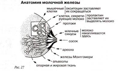 ■■>' :.'■-.'■■. • Зрелая молочная железа состоит из 15—25 сегментов железистой ткани. Каждый сегмент содержит от 10 до 100 собранных в гроздь мельчайших пузырьков — альвеол. Альвеолы пронизаны канальцами, впадающими в выводной млечный проток. Альвеолы окружены специализированными клетками, сокращение которых как бы выжимает молоко из альвеол в протоки. При подходе к ареоле, темному околососковому кружку, протоки расширяются, образуя млечные синусы, и затем открываются отверстиями в области соска. Молоко, которое скапливается в млечных синусах, ребенок выдавливает челюстями при сосании (рис. 27).