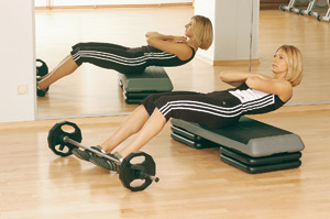 14. Обратное скручивание. Лежа на спине, согните колени и подтяните их к груди так, чтобы пятки находились над ягодицами, а голени были параллельны полу. Руки вытяните вдоль корпуса ладонями вниз или возьмитесь ими для устойчивости за ножки стула, установленного у вас за головой. Не напрягая шею и не отталкиваясь руками, усилием мышц живота медленно оторвите ягодицы на несколько сантиметров от пола. Задержитесь в этом положении на несколько секунд, затем на два счета вернитесь в исходную позицию и выполните еще раз все повторы.