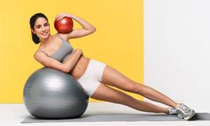 33. Зажмите фитбол ногами. Лягте на спину, руки вытяните вдоль корпуса ладонями вниз. Сначала согните колени, затем поднимите ноги вертикально вверх. Втяните живот и прижмите поясницу к полу. Опуская ноги, вытягивайте носки. Тем самым вы обеспечите более сильное сопротивление и напряжение абдоминальных мышц.