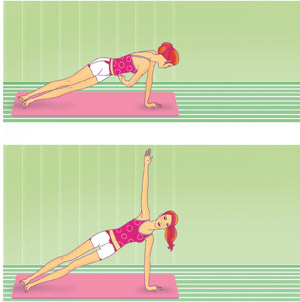 36. Примите правильную позу, когда ладонь упирается в пол прямо под плечом, ноги вытянуты. Втяните пресс и повернитесь вправо, балансируя на левой руке и внешней поверхности стопы. Мышцы ног при этом напрягаются, а ягодицы поднимаются так, чтобы тело оставалось прямым. Напрягите правую руку и вытяните ее вертикально вверх. «Поймайте» равновесие, затем медленно разверните грудь и плечо вниз к полу, а правую руку под грудью переместите влево. Вернитесь в исходное положение и повторите упражнение сначала. Выполняйте 3 подхода по 5 повторов на каждую сторону 3–4 раза в неделю.