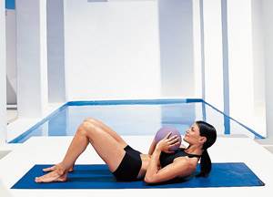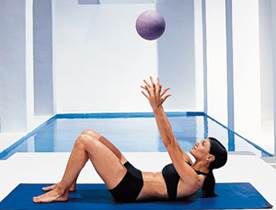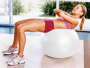 27. Выпрямление ног. Лягте на спину, согните ноги, опираясь ступнями о мяч. Напрягите пресс и, оторвав голову и лопатки от пола, прижмите ладони к верхней части голеней. Медленно отведите руки за голову и выпрямите ноги, откатывая мяч от себя. Согните колени, возвращая мяч в прежнее положение. Одновременно разведите руки в стороны и снова коснитесь ими ног. Голова и плечи все время остаются на весу.