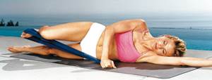 49. Выпрямление и отведение ноги назад. Лягте на левый бок. Сложите эластичную ленту вдвое. В образовавшуюся петлю вставьте правую ступню и согните колено. Левая нога расслаблена. Обхватите концы ленты правой рукой, согнув ее в локте. Левую руку вытяните и опустите на нее голову. Пресс напряжен, позвоночник в нейтральном положении. Вдохните. На выдохе выпрямите правую ногу и, не смещая таза, отведите ее максимально назад. На вдохе вернитесь в исходную позицию. Повторите 8–10 раз сначала с одной, затем с другой стороны.