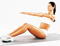•Лягте спиной на пол, положив голени на сиденье стула, согнув колени и разведя носки в стороны. Руки переплетите за головой, обхватив ладонями предплечья. Напрягите пресс и немного подтяните колени к грудной клетке.