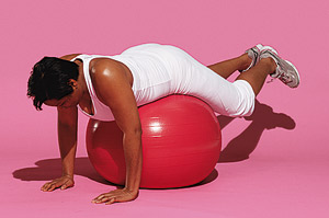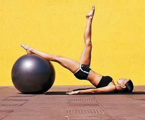 11. Сгибание-разгибание ног. Исходное положение — как и в предыдущем упражнении. Поднимите левую ногу и согните ее в колене. Правой пяткой подкатите мяч к себе, сгибая правую ногу в колене и одновременно выпрямляя левую. Следите за тем, чтобы оба колена оказались на одной линии. Вернитесь в исходное положение и поменяйте ноги. Совет для новичков: ставьте на мяч обе ноги.