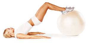 12. Мостик. Работают мышцы ягодиц, пресса и спины. Сядьте на пол, икры на мяче, руки в упоре сзади. Усилием ягодичных мышц приподнимите таз, выпрямляя при этом туловище. Задержитесь на несколько секунд, затем вернитесь в исходное положение и повторите.