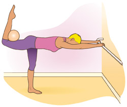 7. Поза воина с подъемом ноги. Встаньте на расстоянии 60–70 см от балетного станка или опоры, которой можно его заменить. Согните правую ногу в колене и захватите ею мяч для пилатеса. Согнитесь и обхватите руками балетный станок, отведите назад правую ногу с мячом, пока она не окажется на уровне, показанном на рисунке. Носок ноги потяните вверх, задержитесь в этом положении на один счет. Выполните упражнение с другой ногой и завершите повтор.