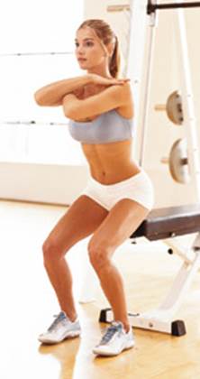 13. Приседание. Встаньте спиной к переднему краю скамьи, ноги на ширине плеч, руки скрещены на груди. Пресс напряжен, спина сохраняет естественный изгиб. Сгибая колени под углом 90° и отводя ягодицы назад, выполните приседание. Усилием мышц бедер и ягодиц вернитесь в исходную позицию.