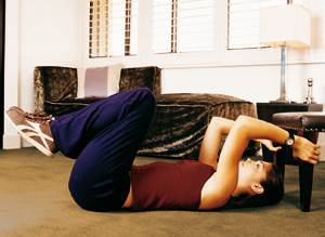 17. Удар ногой из положения лежа. Лягте на спину, колени согнуты, ступни ровно стоят на полу, кисти у подбородка, локти касаются корпуса. Усилием мышц живота оторвите лопатки от пола, одновременно подтягивая левое колено к груди, носок на себя. Сделайте энергичное движение пяткой вперед, отрывая от пола ягодицы и выпрямляя ногу. Вернитесь в исходное положение, поменяйте ноги и повторите.
