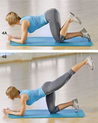 27. Отведение бедра. Разгибание ноги вверх с упором на локти. Встань на четвереньки, согни руки и упрись локтями в пол, затем согни левую ногу в колене, прижав голень к бедру (4А). Вытяни левую ногу вверх, имитируя удар пяткой (4Б). Выполни движение 20-25 раз. Затем смени ногу и повтори упражнение.