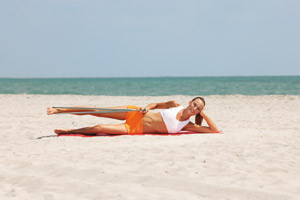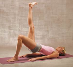 Продвинутый уровень: наденьте на лодыжку поднимаемой ноги манжет-утяжелитель весом 1–1,5 кг. СОВЕТ ЭКСПЕРТА: Руки должны все время лежать на полу. Не пытайтесь ими помогать себе. ОШИБКИ