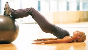 63. Мостик. Лягте спиной на пол, руки слегка разведены в стороны, пятки опираются о мяч. Напрягите мышцы ягодиц и живота. Медленно поднимите таз вверх: тело от плеч до пяток должно напоминать натянутую струну. Вернитесь в исходную позицию. Чтобы было легче выполнять это упражнение, одну ногу положите на пол.