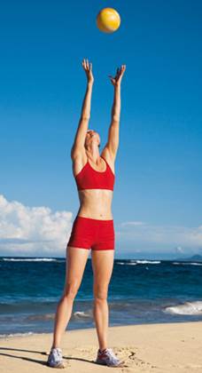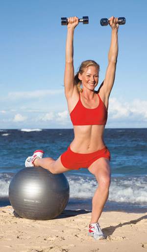 58. Держите утяжеленный мяч (3 кг) обеими руками на уровне груди, стоя на левой ноге. Напрягите пресс и распрямите плечи, отведя их назад и вниз. Опуститесь в полуприсед на левой ноге, держа корпус прямо, правое колено согнуто. Затем выпрямите левую ногу, поднимая мяч над головой и вытягивая правую назад, носок вниз. Мысленно проведите линию от правой пятки к рукам. После чего вернитесь в полуприсед и повторите упражнение. Поменяйте стороны.