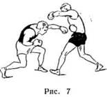 Защита уходами наиболее успешно сочетается со всеми другими видами защиты. 1. Защита уходом назад применяется от всех ударов и серий и может быть выполнена тремя способами: а) шагом правой ногой. Сохраняя положение боевой стойки, боксер делает толчок левой ногой назад и шаг правой ногой назад, после чего левую подтягивает на то же расстояние, на которое сделан шаг правой. Вес тела при этом может быть и равномерно расположен на обеих ногах, и перенесен на правую ногу; б) шагом левой ногой. Выполняется толчком левой ноги и шагом левой назад и влево. Левую ногу можно переместить как на линию правой ноги, так и несколько дальше назад-влево. Вес тела переносят на левую ногу; в) скользящими слитными шагами. Движение производится, как и для шага назад правой ногой. Толчок левой более резок, почти одновременно боксер делает шаг назад правой и ставит левую ногу. 2. Защита уходом вправо выполняется четырьмя способами: а) шагом правой ногой. Толчком левой боксер делает шаг правой вправо, а левую ногу также переставляет вправо на несколько меньшее расстояние, чем правую, для того чтобы более быстро восстановить направление боевой стойки на противника (рис. 5); б) шагом левой ногой (по Б. С. Денисову — «шагом выхода из боя»). Сделав толчок левой ногой, боксер ставит ее справа за линией правой ноги, после чего правую также переставляет вправо; в) шагом правой с поворотом направо. Выполняется, как уход шагом вправо: боксер переносит вес тела на правую ногу, которой опирается о пол (передней частью ступни). Туловище, получившее поступательное движение от толчка левой ноги, немного поворачивает и слегка наклоняет в правую сторону; г) шагом правой с поворотом налево. Толчком левой боксер делает выпад вправо на правую ногу и одновременно туловище поворачивает налево. Во время выпада правую ногу ставит на переднюю часть ступни с поворотом налево. Вес тела полностью переносит на правую ногу, левую ногу слегка подтягивает к правой, оставляя ее впереди на расстоянии несколько большего шага, чем в положении боевой стойки. 3. Защита уходом влево также может быть выполнена четырьмя способами, аналогичными но технике уходу вправо (только в другую сторону). 4. Защиту уходом вперед выполняют шагом левой или правой ноги. Как правило, движение вперед не совсем прямолинейно: для шага левой оно производится вперед-влево, для шага правой — вперед-вправо. Для этой защиты нужно особенно точно определять дистанцию, чтобы избежать столкновения с противником (рис. 6). II. Из защит, выполняемых движением рук, наиболее распространена подставка. Эта защита наиболее удобна для наслоения на защиты, выполняемые движением ног и туловища. Защита подставкой, как и другие, выполняемые движением рук, имеет Подставка может быть выполнена: 1. Правой рукой. Под бьющий кулак могут быть подставлены: а) ладонь правой руки. Применяется от ударов в голову и туловище. Против ударов в голову перчатку правой руки поворачивают внутренней стороной навстречу удару. К моменту соприкосновения с перчаткой бьющей руки ладонь посылается несколько навстречу удару (перчатка открыта, мышцы предплечья и кисти напряжены). Удар принимают на основание ладони и слегка смещают влево. Для защиты подставкой ладони от ударов в туловище правую руку опускают, а удар отводят вправо или влево; б) тыльная сторона правой кисти