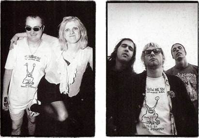 Обратите внимание на футболку от Дэниела Джонстона! Первоначальный владелец Эверетт Тру с Кортни Лав, несколько нетрезвой, за сценой на Редингском фестивале 1991 года; Курт Кобейн с Кристом и Дэйвом, 1992 год, — заметьте, что на Дэйве футболка с надписью «Dickless». (Стивен Свит, СтивДабл/SIN)