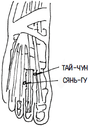 Воздействие на тай‑чун благотворно: при боли, отеках и покраснении глаз, глаукоме, слезотечении или сухости глаз, снижении остроты зрения, возрастном нарушении сумеречного зрения; при эмоциональной неустойчивости и переутомлении; при снижении аппетита, отрыжке и чрезмерном брожении в кишечнике, боли в эпигастрии, горечи во рту и желтушности склер; при головных болях, бессоннице, головокружениях; при нарушении слуха и шуме в ушах; при боли в паху, недержании мочи или задержке мочи, при боли в яичке; при гнойниках и язвочках на слизистой оболочке рта. Точка фу‑лю («возвратное стремительное течение») расположена у переднего края пяточного сухожилия (рис. 20), она относится к меридиану почки.