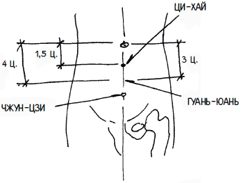 Рис. 22 Тепловое воздействие на данную точку при белях, менструальных нарушениях, задержке или недержании мочи, болях в нижней части живота длится до 15 минут. Воздействуя на гуань‑юань, вы попутно будете избавляться от боли и вздутия в кишечнике; головокружения, шума в ушах, утомляемости, болей в пояснице; от кашля и одышки, вызванных простудой. Точка ци‑хай («море ци») расположена на срединной линии живота, на 1,5 цуня ниже пупка (рис. 22). Уже из названия можно определить, что на данную точку воздействуют, когда существует недостаток или застой активной ци. В гинекологии недостаток ци провоцирует бели, кровотечения, климактерические нарушения, выпадения матки, боли внизу живота и другие проблемы. Прижигание ци‑хай мокса‑сигаретой до 20 минут. Воздействие на данную точку благотворно: при одышке, беспричинном похудании, бессоннице, головных болях; при ночном недержании мочи или задержке мочи и отеках; при опущении желудка и выпадении прямой кишки, при запорах и чрезмерном брожении в кишечнике; при простуде с лихорадочным состоянием. Точка сан‑ин‑цзяо («пересечение трех каналов») расположена на 3 цуня выше лодыжки, у заднего края поверхности большеберцовой кости (рис. 23).