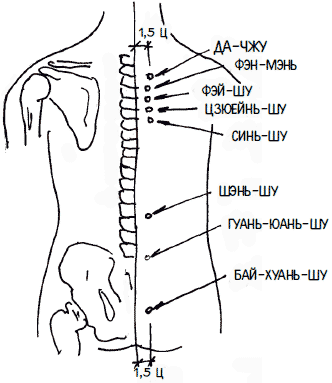Рис. 30 Воздействие на вэнь‑лю полезно также: при болезнях водного обмена (отеки лица и конечностей); при воспалении горла; при боли и онемении в области предплечья и плечевого сустава; при головной боли и психологически неустойчивом состоянии. Точка фу‑лю («возвратное стремительное течение») расположена у переднего края пяточного сухожилия (см. рис. 28, с. 64). При болезнях пищеварительной системы (боль в животе, вздутие живота, урчание в животе, жар в желудке) прижигание полынной сигаретой производится 10–20 минут. Воздействие на фу‑лю полезно также: при бессоннице, сердцебиении, неустойчивых эмоциональных состояниях; при воспалении горла и носовых кровотечениях; при отеке нижних конечностей; при болях в позвоночнике, пояснице и ногах; при мастопатиях и маточных кровотечениях. Точка ян‑ган («главнокомандующий внутренних органов») расположена на 3 цуня кнаружи от остистого отростка 10 грудного позвонка (рис. 31).