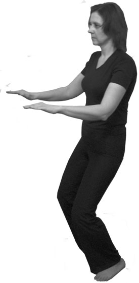 Стойка с давлением книзу Стопы стоят параллельно на ширине плеч. Колени присогнуты (в зависимости от степени сложности, для начала – в высоком исходном положении). Руки согнуты в локтях, предплечья параллельно полу. Ладони обращены вниз, пальцы раздвинуты, с усилием давят на воздух (фото 26). Стойку надо продержать от 1‑й минуты, постепенно доводя до 10 минут. Варианты средней и низкой стойки даны на фото 27, 28.