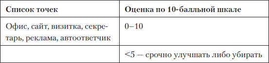 Для увеличения конверсии очень полезно изучить все точки контакта с потенциальным клиентом, которые у вас есть: офис, сайт, визитка, секретарь, реклама, автоответчик, менеджеры, курьеры, грузчики. В общем, все точки, где ваша компания так или иначе соприкасается с покупателем. Оцените по десятибалльной шкале, насколько у вас все хорошо по каждой конкретной позиции. На позиции, набравшие менее пяти баллов, нужно обратить особое внимание. Зачастую эффективнее вообще убрать какую-то позицию, чтобы позже ввести ее вновь, проработав перед этим более качественно. Например, если у вас ужасная реклама, проще ее временно убрать, пока вы не сделаете что-то стоящее, чем тратить деньги и отпугивать клиентов.