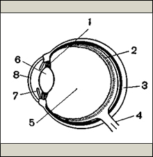 Схематический разрез глазного яблока: 1. аккомодационная мышца, 2. сетчатка, 3. фиброзная оболочка, 4. зрительный нерв, 5. стекловидное тело, 6. хрусталик, 7. радужка, 8. роговица. Наиболее важными для нашего рассмотрения частями глаза являются: роговица, радужная оболочка, хрусталик, сетчатка со светочувствительными зрительными клетками, периферические концы которых называются палочками и колбочками, и, наконец, зрительный нерв, идущий к зрительным центрам полушарий головного мозга. Роговица прозрачна и пропускает свет во внутреннее ядро глаза. Радужная оболочка играет роль диафрагмы, регулирующей количество света, поступающего в глаз, благодаря чему зрачок (круглое отверстие в радужной оболочке) при сильном свете суживается, а при слабом расширяется. Но радужная оболочка реагирует не только на различия в яркости. Хрусталик является светопреломляющей средой глазного яблока. Он отбрасывает на сетчатую оболочку обратное, уменьшенное изображение поля обзора. В сетчатой оболочке, или сетчатке, находятся мельчайшие окончания волокон зрительного нерва, светочувствительные зрительные клетки, палочки и колбочки, расположенные очень близко друг от друга. Зрение, которое осуществляется в основном или исключительно при помощи палочек, называется сумеречным зрением. Оно не позволяет различать хроматические цвета, а различает лишь оттенки серого. Зрение, в котором участвуют в основном или исключительно колбочки, называется дневным зрением. Дневное зрение дает возможность видеть все цвета. Колбочки и палочки содержат в себе некую жидкость, так называемый зрительный пурпур. По выходе из глаза пучки нервных волокон формируются в зрительный нерв, по которому световые раздражения передаются в зрительный центр головного мозга. В центральной части сетчатой оболочки находится так называемое желтое пятно. Это место наибольшей остроты зрения и восприимчивости к цвету. В месте выхода зрительного нерва из сетчатки светочувствительные элементы отсутствуют, вследствие чего это место не дает зрительного ощущения и поэтому называется слепым пятном. Зрительный нерв Нервы - это пучки волокон, служащих для передачи раздражений. Световые раздражения, падающие на рецептор, заложенный в сетчатке, превращаются в нервные импульсы, которые благодаря слабым биоэлектрическим токам проходят по проводящим путям от рецептора света до коры головного мозга, где воспринимаются в виде зрительных ощущений.. Зрительный центр головного мозга: головной мозг состоит из двух полушарий и из целого ряда полей, выполняющих определенные функции. То, что мы видим или слышим, может удерживаться зрительной или слуховой памятью. Процесс зрительного восприятия: зрительное восприятие (видение) является функцией нашего зрения. Благодаря цветовой дифференциации поля зрения мы различаем окружающие нас предметы, воспринимаем их расположение в пространстве, их облик и форму. СВЕТОВАЯ И ЦВЕТОВАЯ АДАПТАЦИЯ Date: 2015-08-22; view: 423; Нарушение авторских прав |