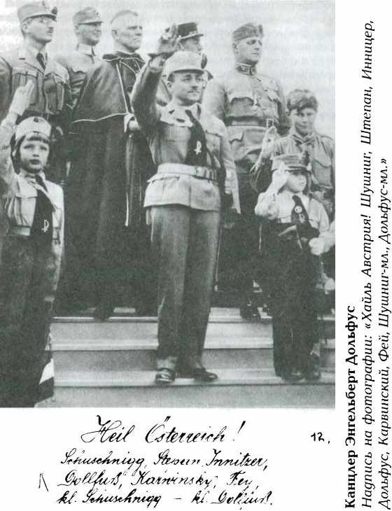 Начались многочисленные выходы из церкви, которые, в конце концов, привели к запоздалому отказу Зайпеля от активной политической деятельности. Однако, и находясь за кулисами, он держал все нити в своих руках. Гораздо более слабые правительства социально‑христианских политиков (Штрерувица, Вогуэна) или немецкого националиста Шобера оставались в тени укреплявшегося и становившегося все более радикальным хаймвера. В мае 1930 г. в «Корнойбургской клятве» хаймвер заявил об отказе от демократии западного образца и потребовал создания сословного однопартийного государства, что представляло собой чисто фашистскую программу («Мы возьмем власть в государстве. Мы отвергаем демократию и парламентаризм. Мы являемся приверженцами принципов фашизма»). В ноябрьских выборах 1930 г. (как выяснилось потом, они на долгое время стали последними парламентскими выборами) хаймверовцы участвовали как «Отечественный блок» и получили 9 мандатов. Социальные христиане получили 66 мест, блок Шобера – 19. Таким образом, буржуазный лагерь располагал солидным большинством, но все же социал‑демократическая партия с ее 72 местами в парламенте представляла собой сильнейшую партию страны. Положение усугублялось первыми, пока еще незначительными успехами национал‑социалистов. Хотя они не получили ни одного мандата, за них проголосовало почти 100 тыс. человек. /368/ Паника в рядах социальных христиан возросла, когда на последовавших вскоре местных выборах поданных за национал‑социалистов голосов существенно прибавилось. Еще более слабые социально‑христианские правительства (Отто Эндера, Карла Буреша, «правительство слабой руки») должны были, прежде всего, бороться с проявлениями мирового экономического кризиса (начавшегося в «черную пятницу» 24 октября 1929 г. на Уолл‑стрит), который поставил под угрозу успехи «санации Зайпеля». Милитаризация общества и радикализация вооруженных организаций были следствиями безработицы и неуверенности в будущем. Выдвинувшийся в это время социально‑христианский политик Курт фон Шушниг{62} организовал в качестве своей опоры и противовеса хаймверу штурмовые отряды явно монархической ориентации. Части штирийского хаймвера во главе с Вальтером Пфримером попытались в 1931 г. осуществить путч, который, однако, в течение нескольких часов провалился сам со‑ /369/ бой. Хотя Пфримеру было предъявлено обвинение в государственной измене, он был оправдан. В 1932 г. ушли из жизни две выдающиеся личности двадцатых годов – Зайпель и Шобер. На их место пришло новое поколение политиков, наиболее видными из которых были Энгельберт Дольфус{63} и Курт Шушниг; оба были министрами в кабинете Буреша. Огромный успех национал‑социалистов на местных выборах /370/ 1932 г. – во время которых лагерь немецких националистов заметно дрейфовал в сторону свастики, а социальные христиане потеряли немало своих избирателей – убедил правящие круги в том, что новые выборы нужно, по меньшей мере, отсрочить или вообще отменить. Когда Доль‑ фус возглавил правительство, многие думали, что «сильный человек» нашелся. Экономические трудности, порожденные мировым кризисом, можно было преодолеть при помощи Лиги Наций, которая в соответствии с Лозаннским протоколом 1932 г. предоставила кредит в 300 млн. шиллингов; однако этот договор вызвал в стране бурную дискуссию, посколь