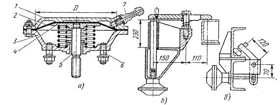 где Р2 — сопротивление пружины в сжатом состоянии, Н. Величина Р2 зависит от размеров пружины, подбираемой таким образом, чтобы на всем протяжении обратного хода пружина преодолевала сопротивление трения манжет и штока. Пневмокамеры. Диафрагменная камера (рис. 6.17) представляет собой замкнутую полость, разделенную эластичной перегородкой — диафрагмой на две части. Приводы с диафрагменными камерами имеют ряд преимуществ перед приводами с цилиндрами: камеры проще в изготовлении и дешевле цилиндров; камеры долговечнее, так как диафрагма работает дольше, чем уплотнения цилиндров; отсутствие утечки воздуха, так как обе полости камеры не соединяются между собой; в камерах может быть использован сжатый воздух более влажный и загрязненный, чем в цилиндрах, так как он не соприкасается с трущимися частями. Недостатком камер является малый ход штока, обычно составляющий 30…40 мм.