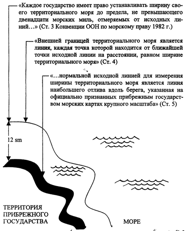 Территориальное море (территориальные воды) – морской пояс, прилегающий к берегу или внутренним морским (или архипелажным) водам государства, на который распространяется его суверенитет. В Конвенции о территориальном море и прилегающей зоне 1958 г. и Конвенции ООН по морскому праву 1982 г. (ч. II) отражена специфика территориального моря (рис. 3). В соответствии с требованиями норм международного права каждое прибрежное государство в соответствии с национальным законодательством определяет правовой режим своего территориального моря, так как оно входит в состав государственной территории, а его внешняя граница является государственной границей прибрежного государства на море (рис. 4).